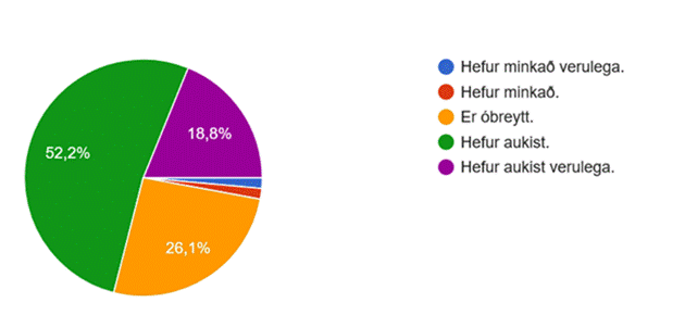 Þegar spurt var um mat á áfengisneyslu unglinga sl. tvö ár kemur fram að 71% telja að hún hafi aukist og þar af 18,8% sem telja að hún hafi aukist verulega.